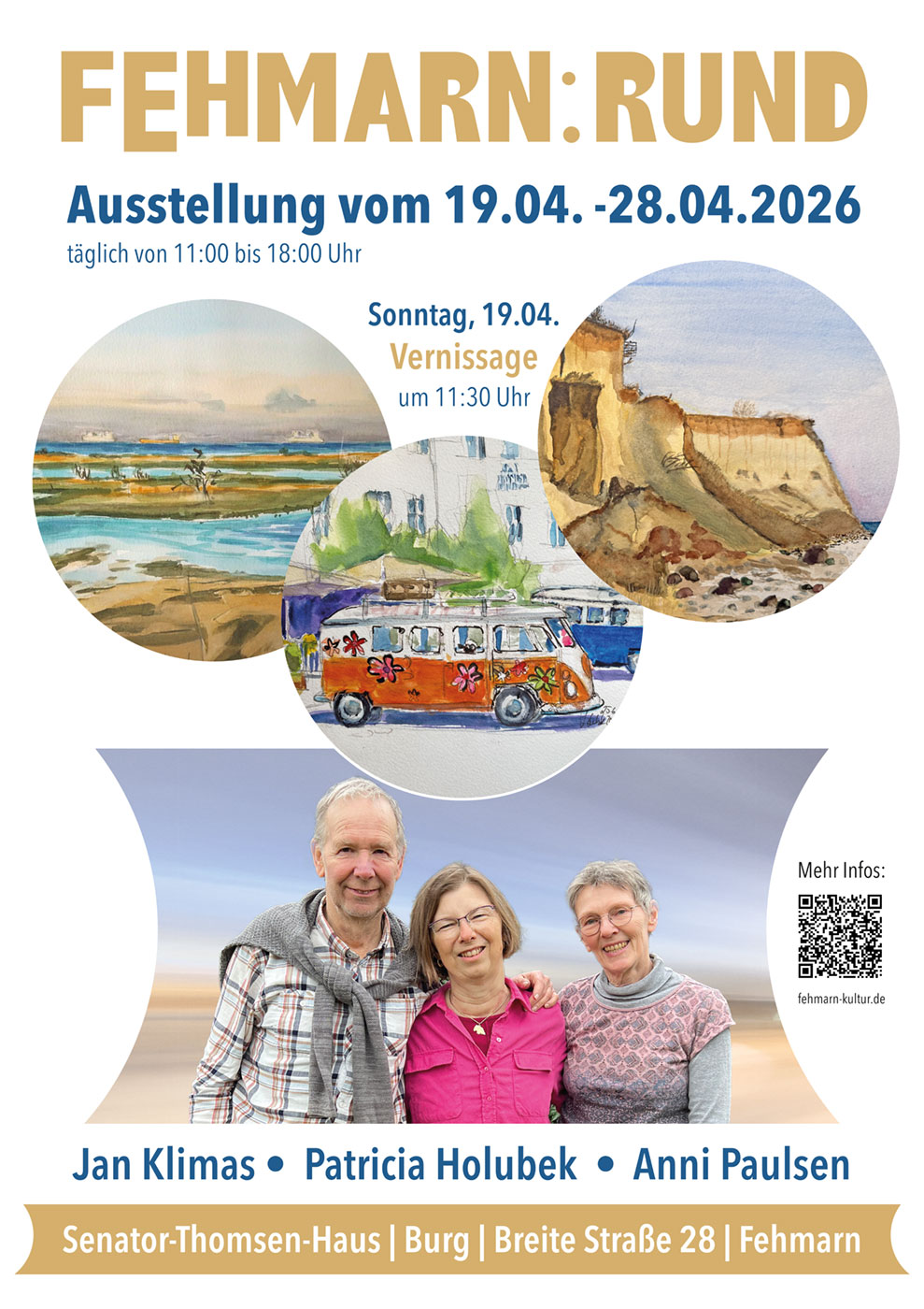 Die Ausstellung FEHMARN:RUND zeigt Aquarelle, Acryl- und Ölbilder der Künstlerinnen Anni Paulsen und Patricia Holubek sowie des Künstlers Jan Klimas. Sie findet vom 19. bis 28. April 2026 im Senator-Thomsen-Haus in Burg auf Fehmarn statt.