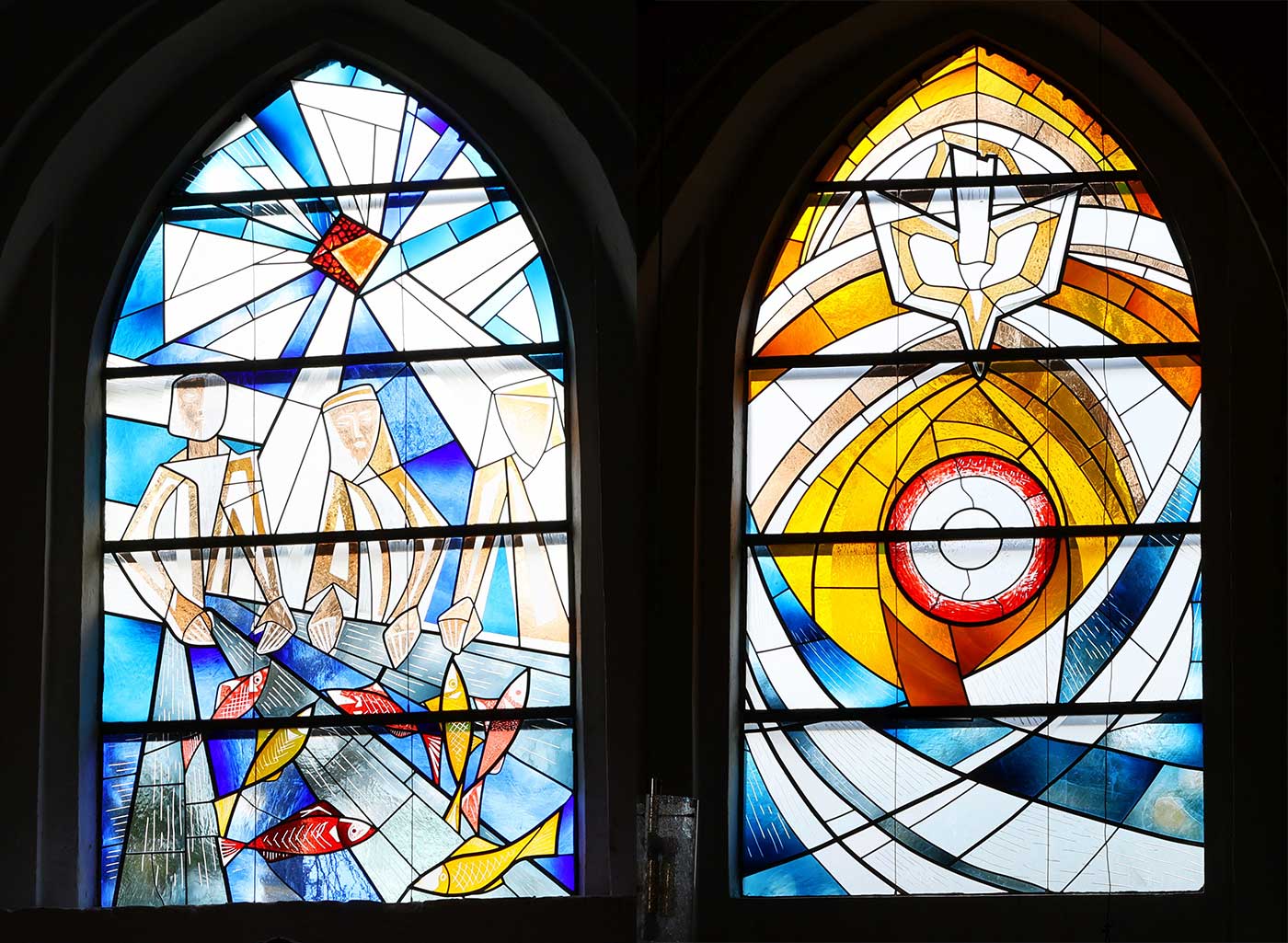 Dargestellt werden „Der Fischzug des Petrus" (Foto) und die „Ausgießung des Heiligen Geistes". Erst bei Einfall des Sonnenlichtes wird die vom Künstler gewollte Wirkung dieser ausdrucksvollen, bleiverglasten Kunstwerke erzielt.